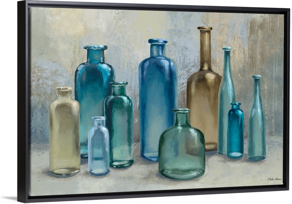 <p>A contemporary still life painting of ten blue and beige glass bottles.</p>