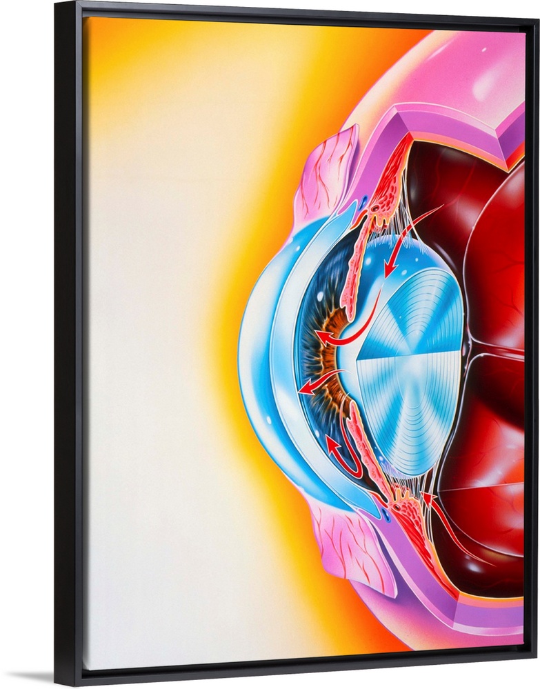 <p>Glaucoma. Artwork showing the flow of the watery aqueous humour (arrows) in a human eye with glaucoma, abnormally high pressure in the eye. The humour, which is continuously produced from blood capillaries, can no longer flow out of the eye through the Schlemm's canals (small dark blue tubes in cross-section at upper</p>