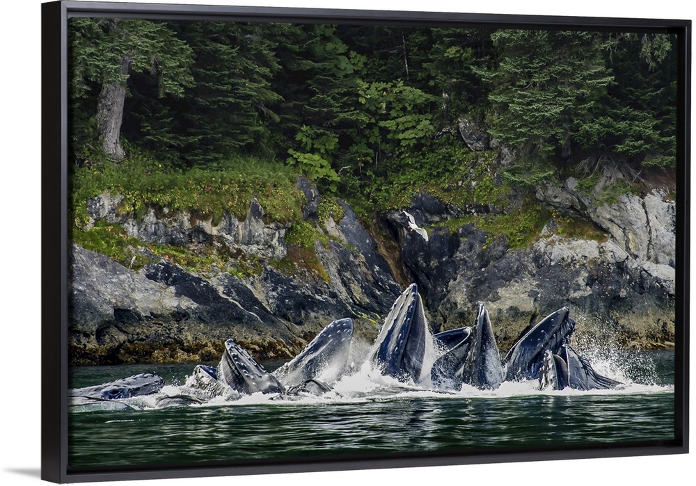 <p>Glaucous-winged Gull (Larus glaucescens) over bubble-net feeding Humpback Whales (Megaptera novaeangliae) Chatham Strait, Tongass National Forest, Alaska, United States of America</p>
