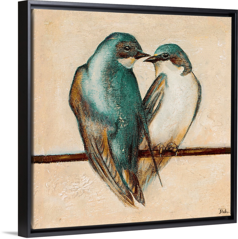 <p>Contemporary painting of a pair of swallows perched together on a line.</p>
