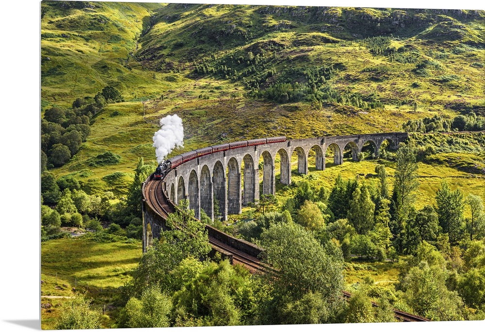 <p>Glenfinnan Railway Viaduct in Scotland with the Jacobite steam train passing over.</p>
