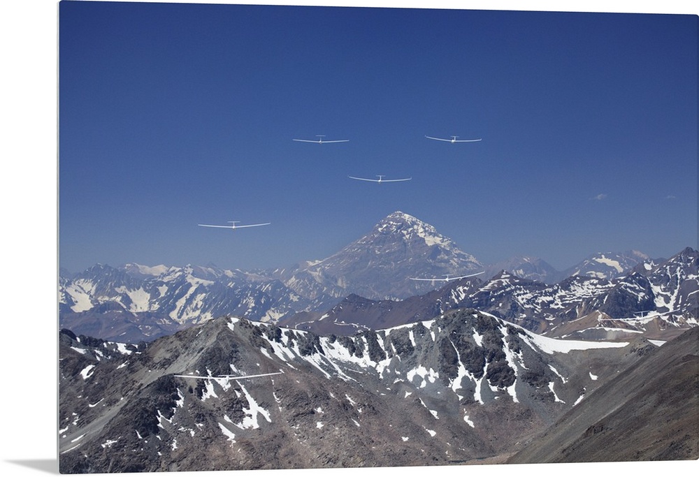 <p>Gliders Racing in FAI World Sailplane Grand Prix, Andes Mountains, Chile, (and at right Aconcagua 6,962 m - 22,841 ft, Argentina), South America.</p>
