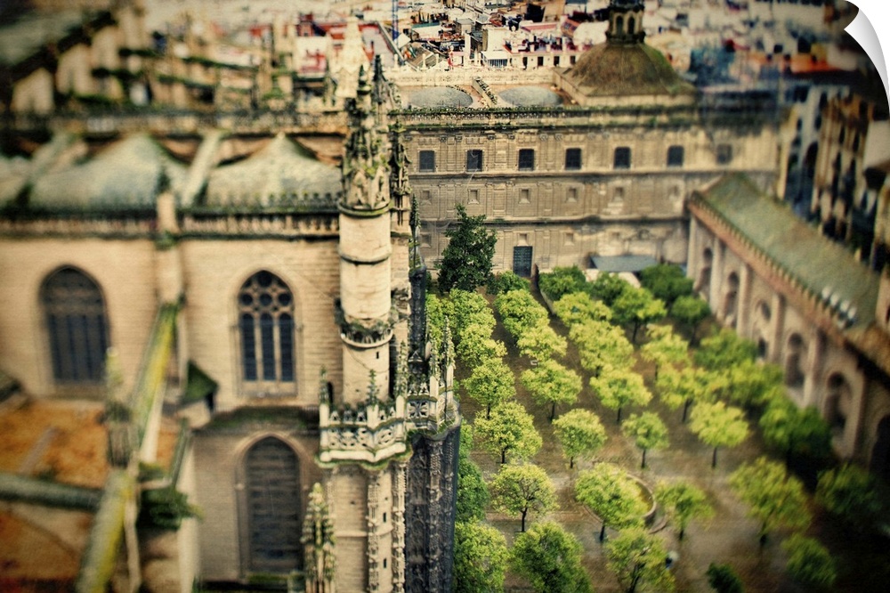 <p>View of the Cathedral and Orange Tree Yard from the top of the Giralda tower, Seville, Spain. Tilted lens used for a shallower depth of field.</p>