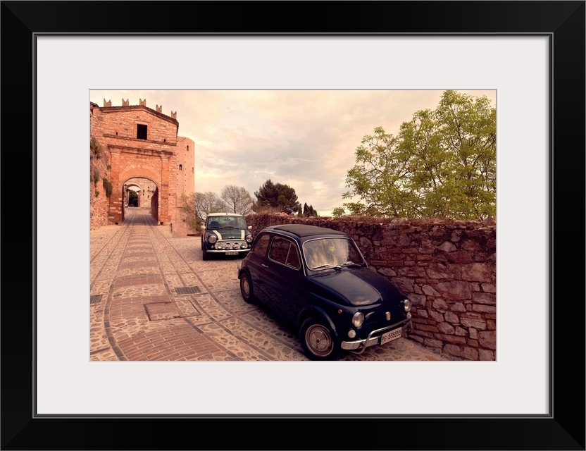 <p>Glimpse of Spello with vintage cars in the foreground, Spello, Perugia district, Umbria, Italy.</p>