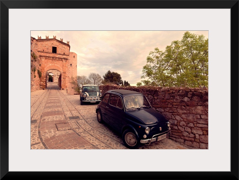 <p>Glimpse of Spello with vintage cars in the foreground, Spello, Perugia district, Umbria, Italy.</p>