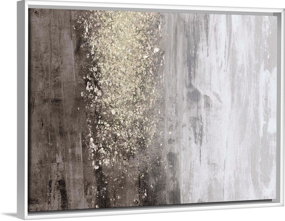 <p>A horizontal, neutral abstract in tones of warm grey with a glittery gold accent. The background is reminiscent of natural wood, and it would make a great statement piece in a contemporary setting.</p>