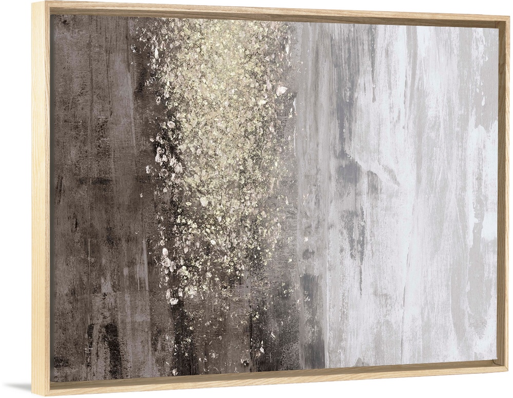 <p>A horizontal, neutral abstract in tones of warm grey with a glittery gold accent. The background is reminiscent of natural wood, and it would make a great statement piece in a contemporary setting.</p>