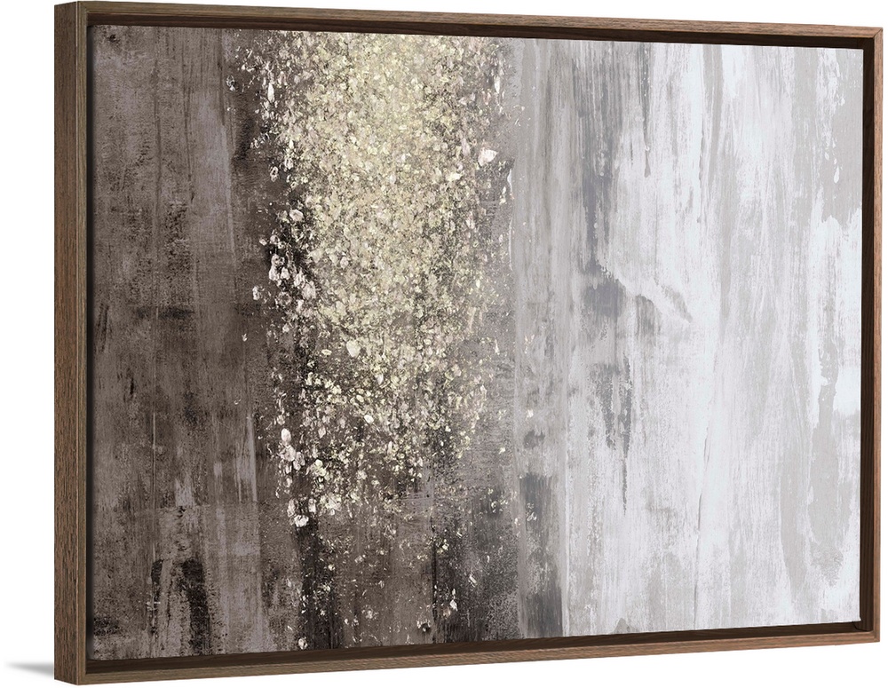 <p>A horizontal, neutral abstract in tones of warm grey with a glittery gold accent. The background is reminiscent of natural wood, and it would make a great statement piece in a contemporary setting.</p>