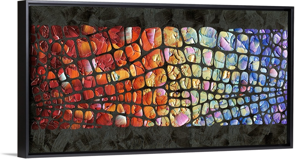<p>Abstract painting with a multicolored scale pattern on a black textured background.</p>
