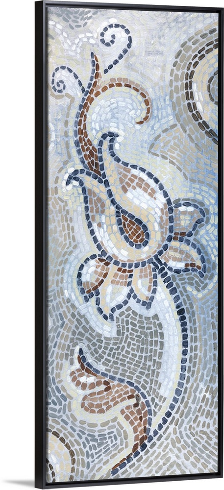 <p>Abstract panel painting of a flower created with mosaic tile-like brushstrokes in blue, brown, gray, and white hues.</p>