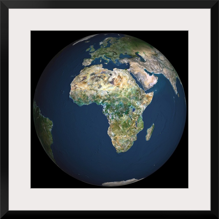 <p>Globe Africa, True Colour Satellite Image. Earth. True colour satellite image of the Earth, centred on Africa. North is at top. Water is blue, vegetation is green, arid areas are brown, and snow and ice are white. Both land and ocean floor topography are shown. The terrain of Africa varies from rock and sand (grey and brown) in the Sahara in North Africa, to tropical rainforests (dark green) in Western and Central Africa, to savannah and plains (brown and green) in southern and eastern Africa. Surrounding Africa (clockwise from top) is Europe and the Mediterranean, the Arabian Peninsula, the Indian Ocean and the island of Madagascar, and the Atlantic Ocean. At the edge of the globe are India (upper right), Antarctica (bottom), South America (lower left) and Greenland (top). The image used data from LANDSAT 5 & 7 satellites.</p>