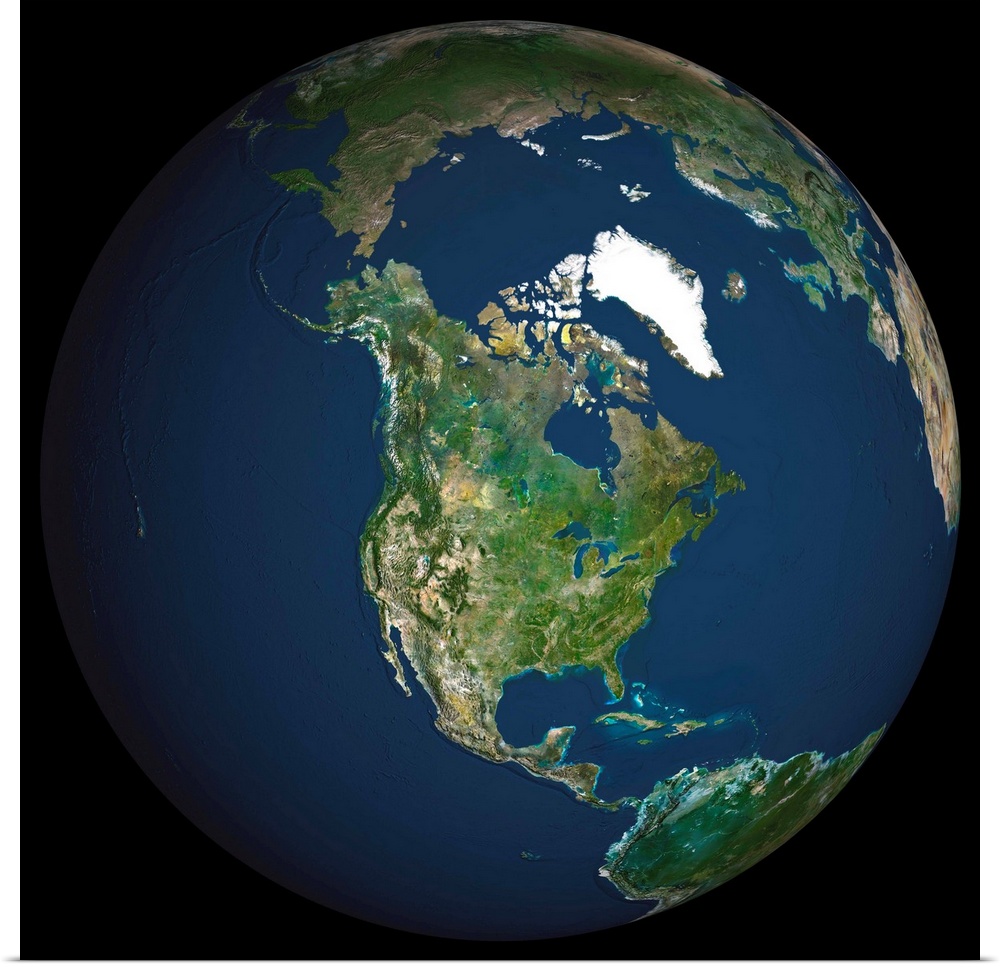 <p>Globe North America, True Colour Satellite Image. Earth. True colour satellite image of the Earth, centred on North America. The North Pole is at upper centre. Water is blue, vegetation is green, arid areas are brown, and snow and ice are white. Both land and ocean floor topography are shown. The terrain of North America is marked by mountain ranges on the western coast, deserts in the southwest, and large lakes in the northeast. The shades of green vary, showing central plains, marshes in the far north, swamps in the southeast and forests in the northwest. Surrounding North America (clockwise from top) is the Arctic Ocean, Greenland, and the Atlantic Ocean (beyond which are Asia, Europe and Africa), South America and the Pacific Ocean. The image used data from LANDSAT 5 & 7 satellites.</p>