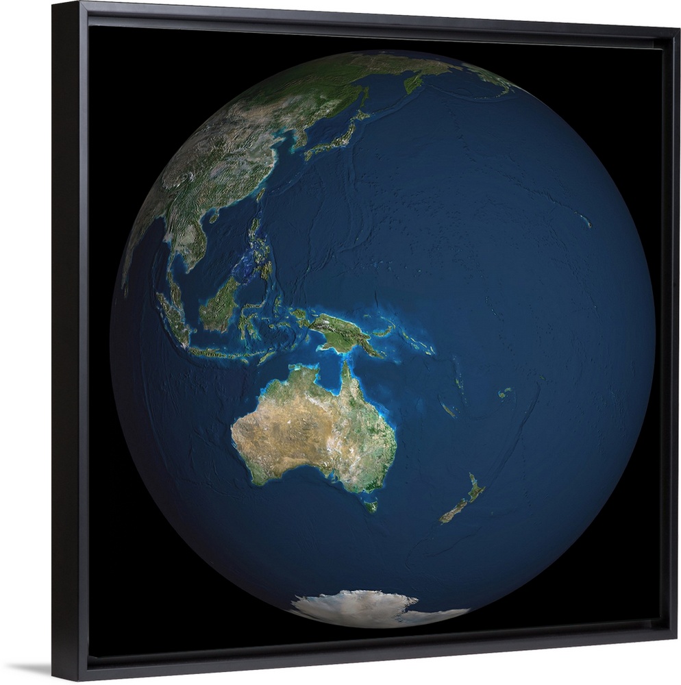 <p>Globe Oceania, True Colour Satellite Image. Earth. True colour satellite image of the Earth, centred on the region of Oceania. North is at top. Water is blue, vegetation is green, arid areas are brown, and snow and ice are white. Both land and ocean floor topography are shown. Shallow coastal waters are light blue. Oceania consists of small islands scattered around the western Pacific Ocean. Archipelago (centre left). Australia (lower left), New Zealand (lower right), part of mainland Asia (top left), the Mala and Antarctica (bottom centre), are also seen. Deserts are seen in the Australian interior, and tropical forests along the Australian coast and in the islands of the Malay Archipelago. The image used data from LANDSAT 5 & 7 satellites.</p>
