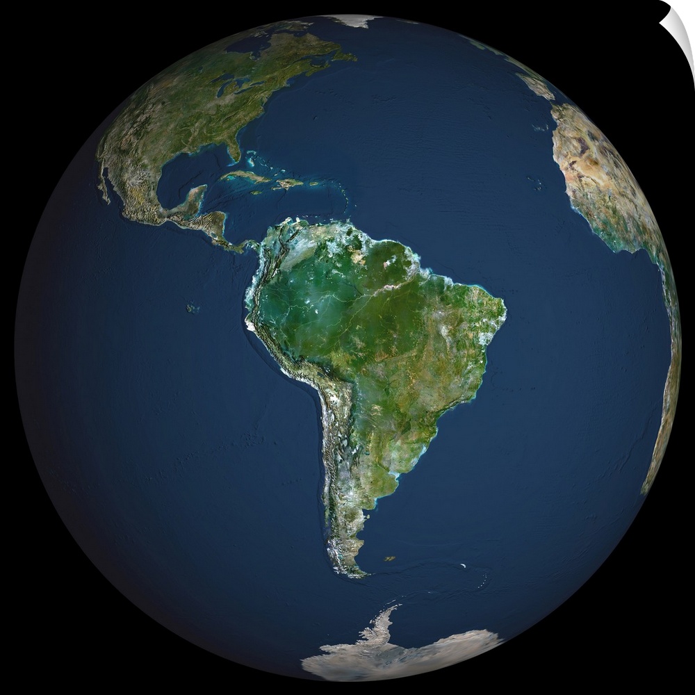 <p>Globe South America, True Colour Satellite Image. Earth. True colour satellite image of the Earth, centred on South America. North is at top. Water is blue, vegetation is green, arid areas are brown, and snow and ice are white. Both land and ocean floor topography are shown. The terrain of South America is marked by the Andes mountains along the western coast, tropical rainforests (dark green) in the Amazon river basin in the north, and swamps and plains (lighter green) in the south. Surrounding South America (clockwise from upper left) is North America and the Caribbean islands, the Atlantic Ocean (right) and the Pacific Ocean (left). Parts of Greenland, Europe, Africa and Antarctica are also seen on the edges of the globe. The image used data from LANDSAT 5 & 7 satellites.</p>