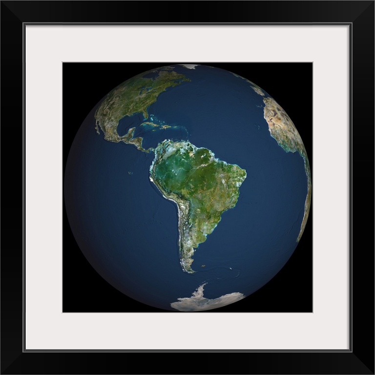 <p>Globe South America, True Colour Satellite Image. Earth. True colour satellite image of the Earth, centred on South America. North is at top. Water is blue, vegetation is green, arid areas are brown, and snow and ice are white. Both land and ocean floor topography are shown. The terrain of South America is marked by the Andes mountains along the western coast, tropical rainforests (dark green) in the Amazon river basin in the north, and swamps and plains (lighter green) in the south. Surrounding South America (clockwise from upper left) is North America and the Caribbean islands, the Atlantic Ocean (right) and the Pacific Ocean (left). Parts of Greenland, Europe, Africa and Antarctica are also seen on the edges of the globe. The image used data from LANDSAT 5 & 7 satellites.</p>
