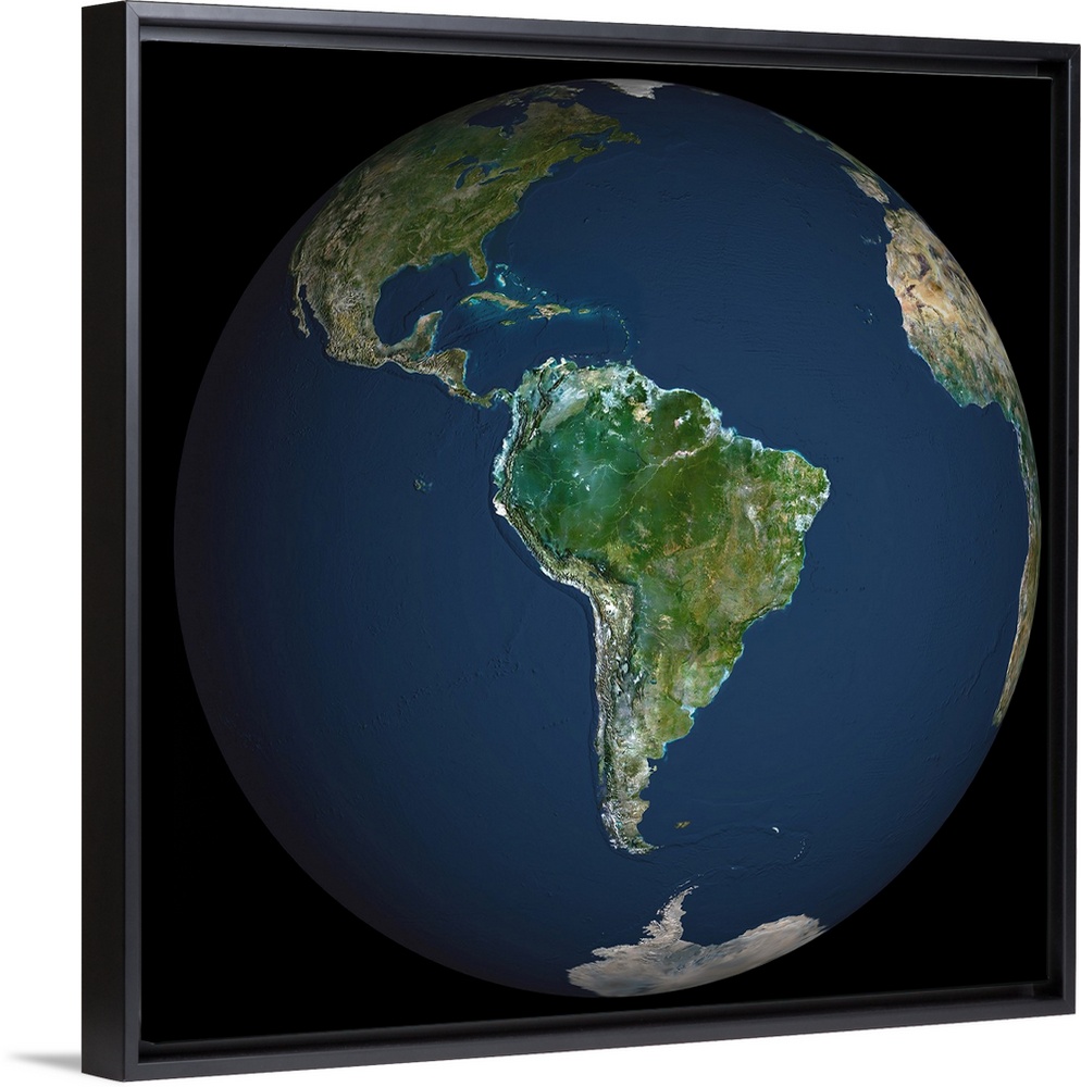 <p>Globe South America, True Colour Satellite Image. Earth. True colour satellite image of the Earth, centred on South America. North is at top. Water is blue, vegetation is green, arid areas are brown, and snow and ice are white. Both land and ocean floor topography are shown. The terrain of South America is marked by the Andes mountains along the western coast, tropical rainforests (dark green) in the Amazon river basin in the north, and swamps and plains (lighter green) in the south. Surrounding South America (clockwise from upper left) is North America and the Caribbean islands, the Atlantic Ocean (right) and the Pacific Ocean (left). Parts of Greenland, Europe, Africa and Antarctica are also seen on the edges of the globe. The image used data from LANDSAT 5 & 7 satellites.</p>