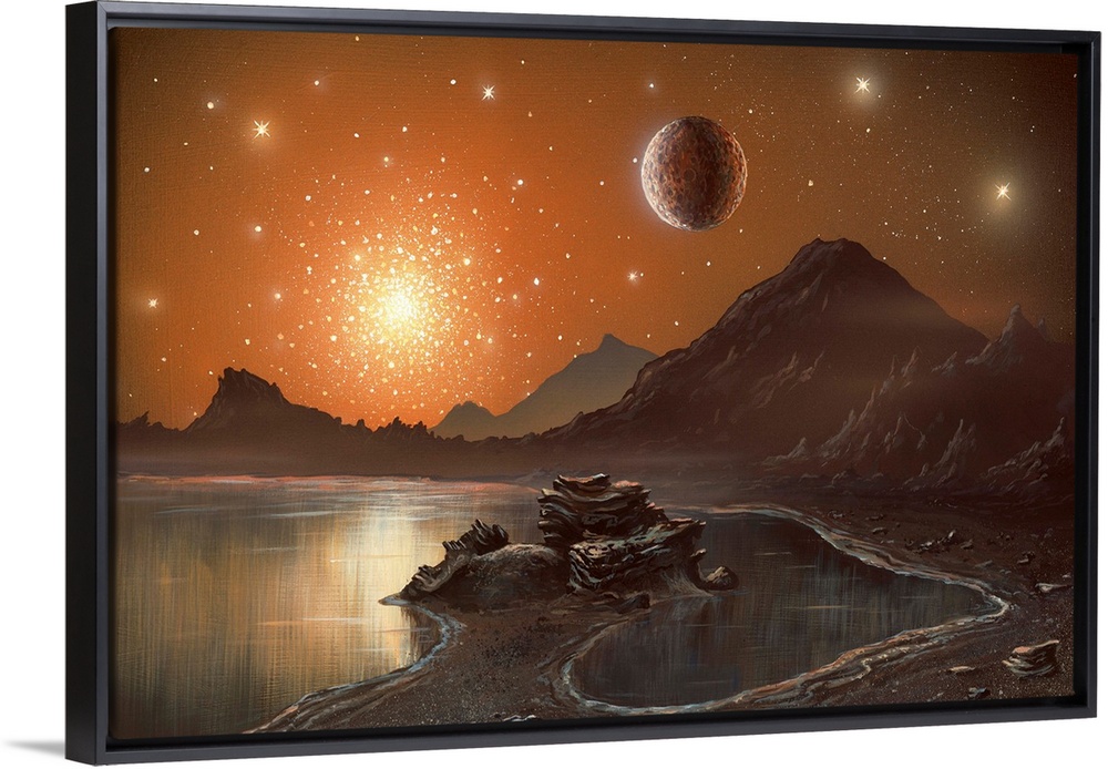<p>Globular cluster. Artwork of a view across waters on an alien planet, towards its moon and a globular star cluster in the sky above. Globular clusters are dense spherical collections of stars that can contain over a million stars within a volume only a few hundred light years across. They formed early in the history of the universe and their stars are thought to be amongst the oldest known.</p>