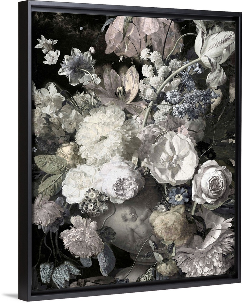 <p>Desaturated artwork showing a romantic bouquet of flowers in a vase with a cherub on it over a dark background.</p>