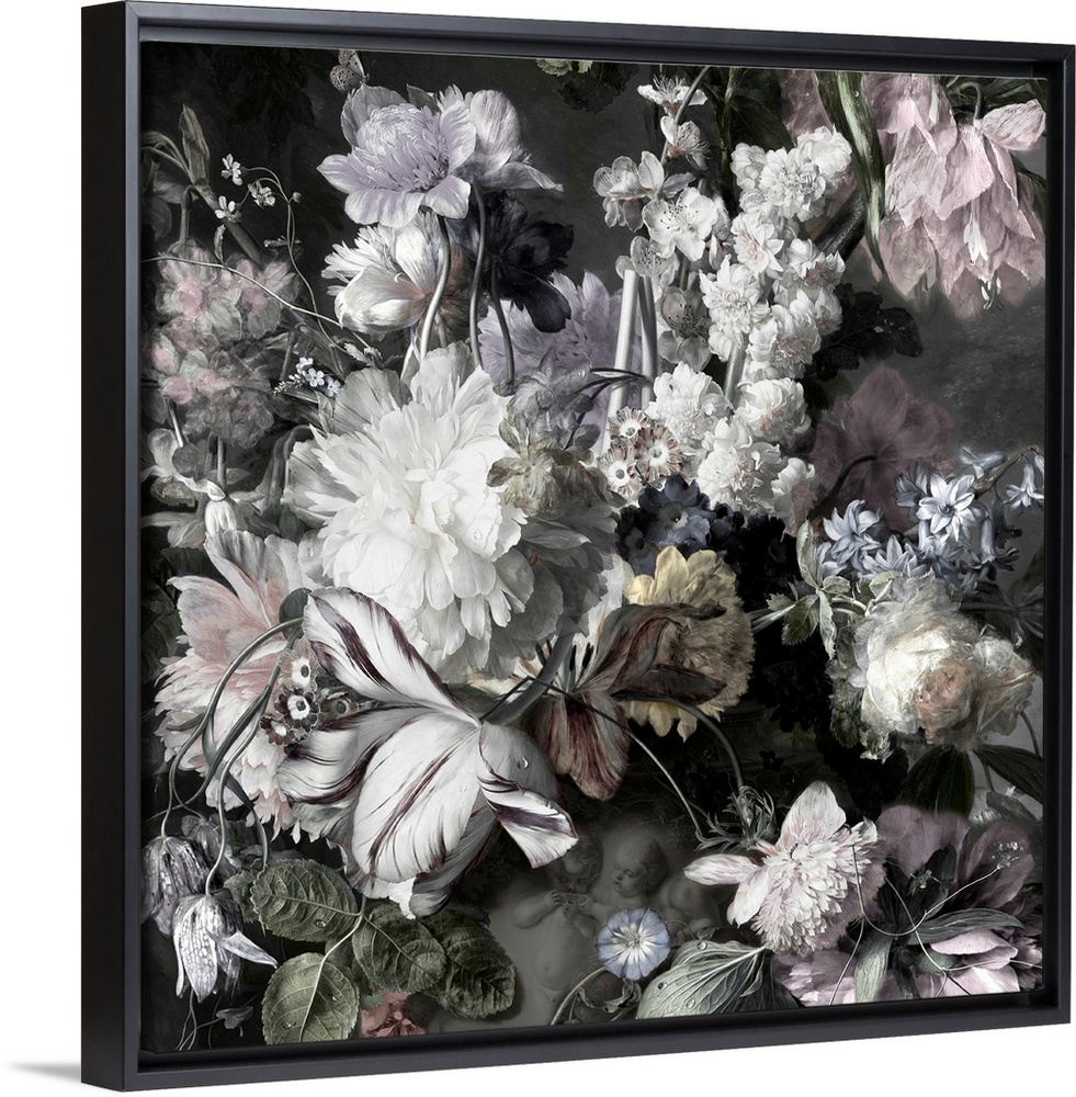 <p>Desaturated artwork showing a romantic bouquet of flowers in a vase with cherubs on it over a dark background.</p>