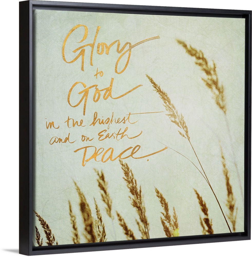 <p>Square photograph of the tips of beach grass swaying in the wind with the quote "Glory to God in the highest and on Earth peace" written on the side in metallic gold.</p>