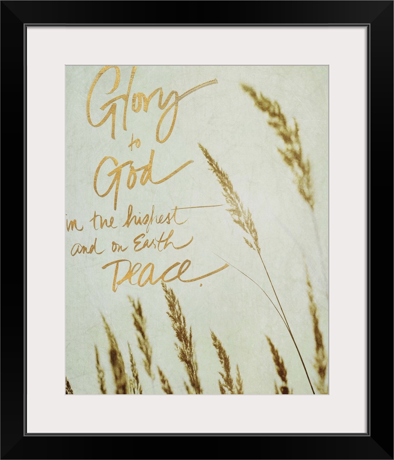 <p>Photograph of the tips of beach grass swaying in the wind with the quote "Glory to God in the highest and on Earth peace" written on the side in metallic gold.</p>