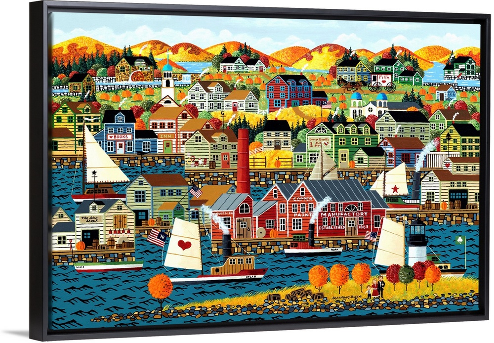 <p>Contemporary painting of a coastal village in autumn foliage.</p>