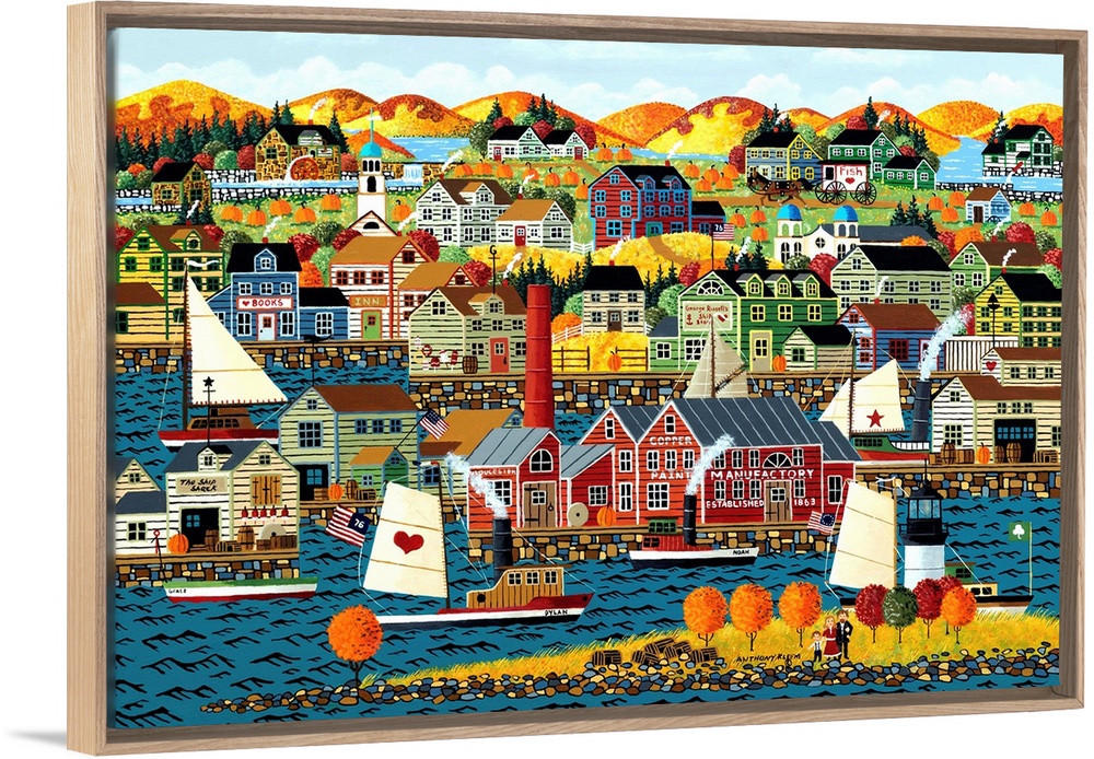 <p>Contemporary painting of a coastal village in autumn foliage.</p>