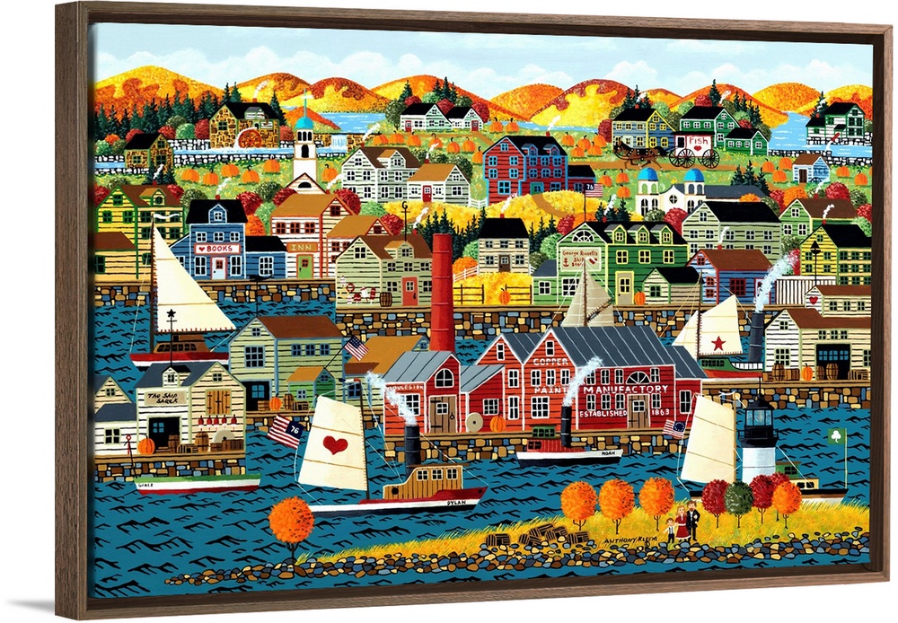 <p>Contemporary painting of a coastal village in autumn foliage.</p>