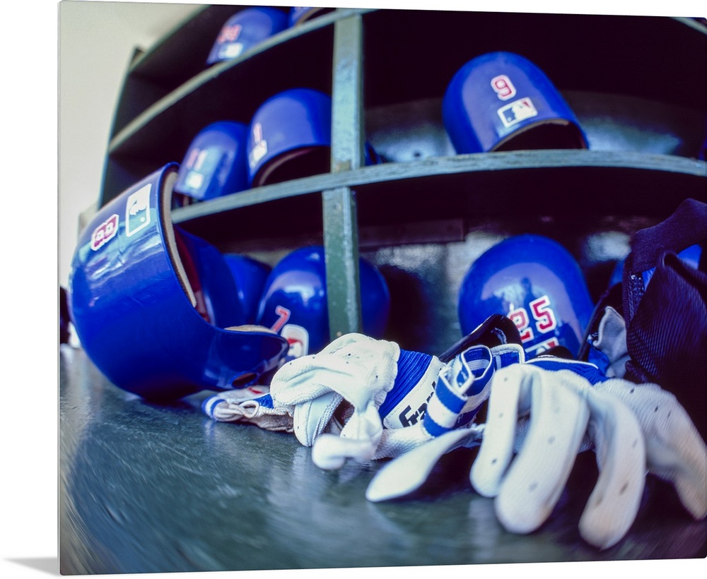 <p>Cubs gloves and helmets, Cubs vs Phillies, Wrigley Field, Chicago, Illinois, USA, July 31, 2003</p>
