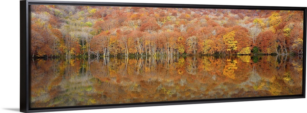 <p>A vast forest in autumn foliage with only couple of trees still green left over from summer, reflecting in the lake below.</p>