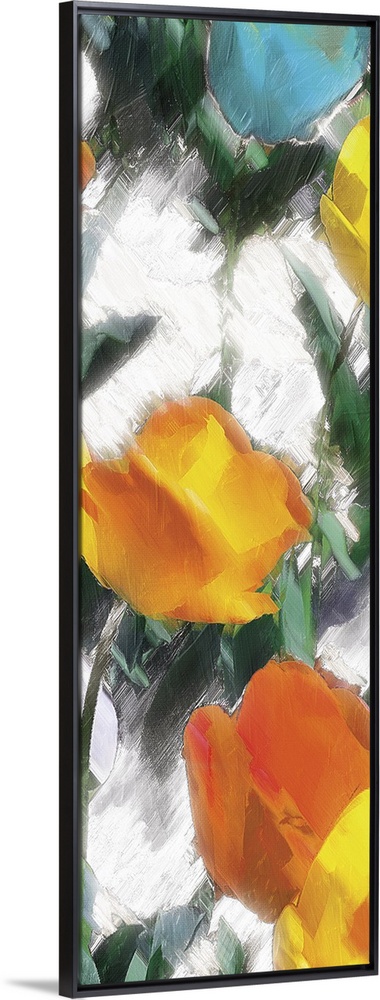<p>A contemporary abstract painting of yellow, orange, red, and blue flowers on a white background made up of broad diagonal brushstrokes.</p>