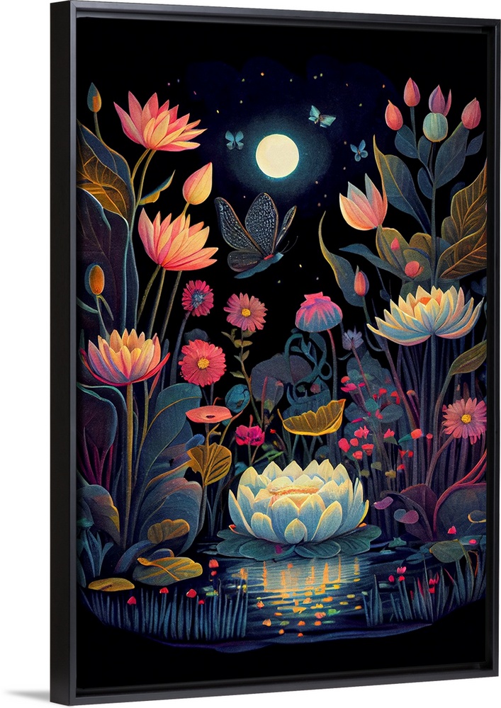 <p>This image by JK Stewart for Duirwaigh Studios is of a lotus flower in a pond at night.</p>