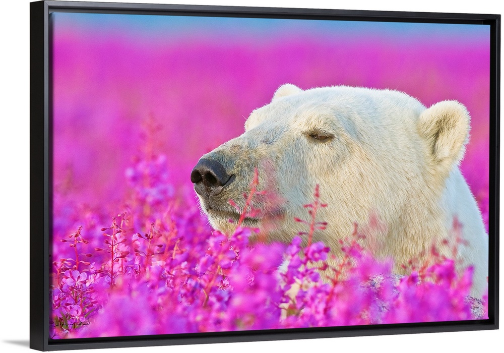 <p>Polar Bear portrait at sunset in a field of glowing fireweed on an island off the sub-Arctic coast of Hudson Bay, Churchill, Manitoba, Canada.</p>