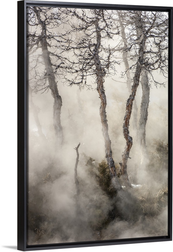 <p>Gnarled juniper tree trunks (Juniperus) emerge through the misty steam in Mammoth Hot Springs in Yellowstone Natural Park, Wyoming, United States of America</p>
