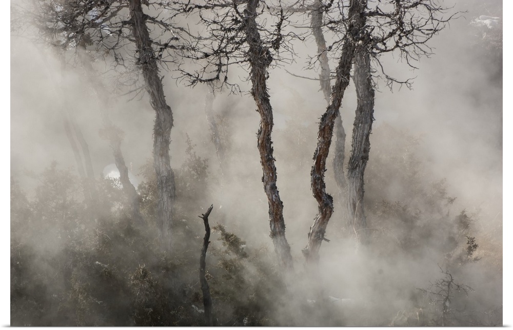 <p>Gnarled juniper tree trunks (Juniperus) emerge through the misty steam in Mammoth Hot Springs in Yellowstone Natural Park Wyoming, United States of America</p>