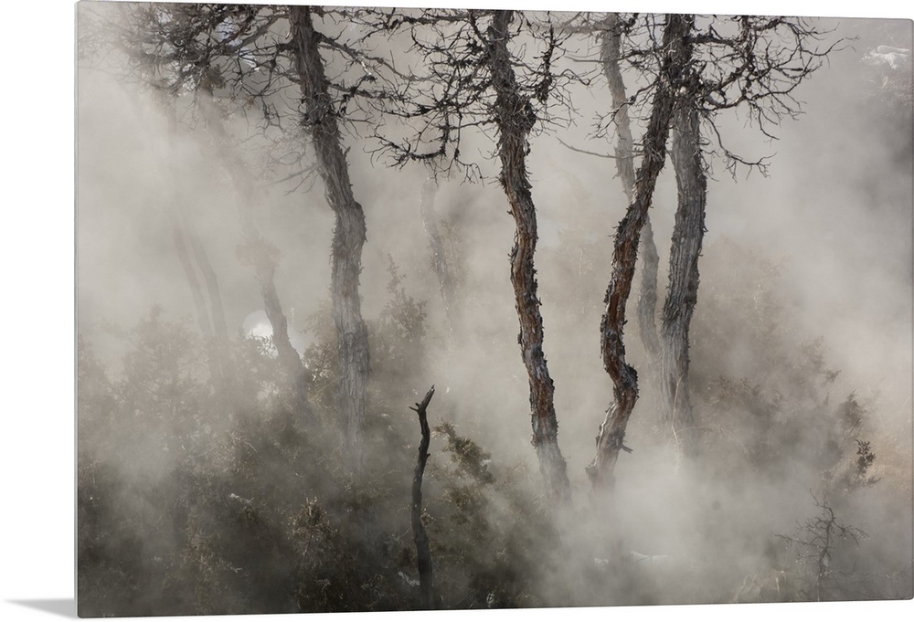 <p>Gnarled juniper tree trunks (Juniperus) emerge through the misty steam in Mammoth Hot Springs in Yellowstone Natural Park Wyoming, United States of America</p>