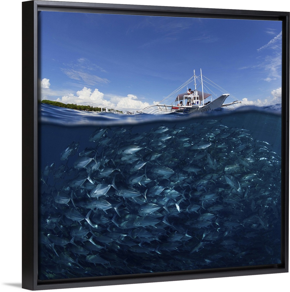 <p>Underwater view of a large school of jackfish near the surface of the water, under a boat, Philippines.</p>