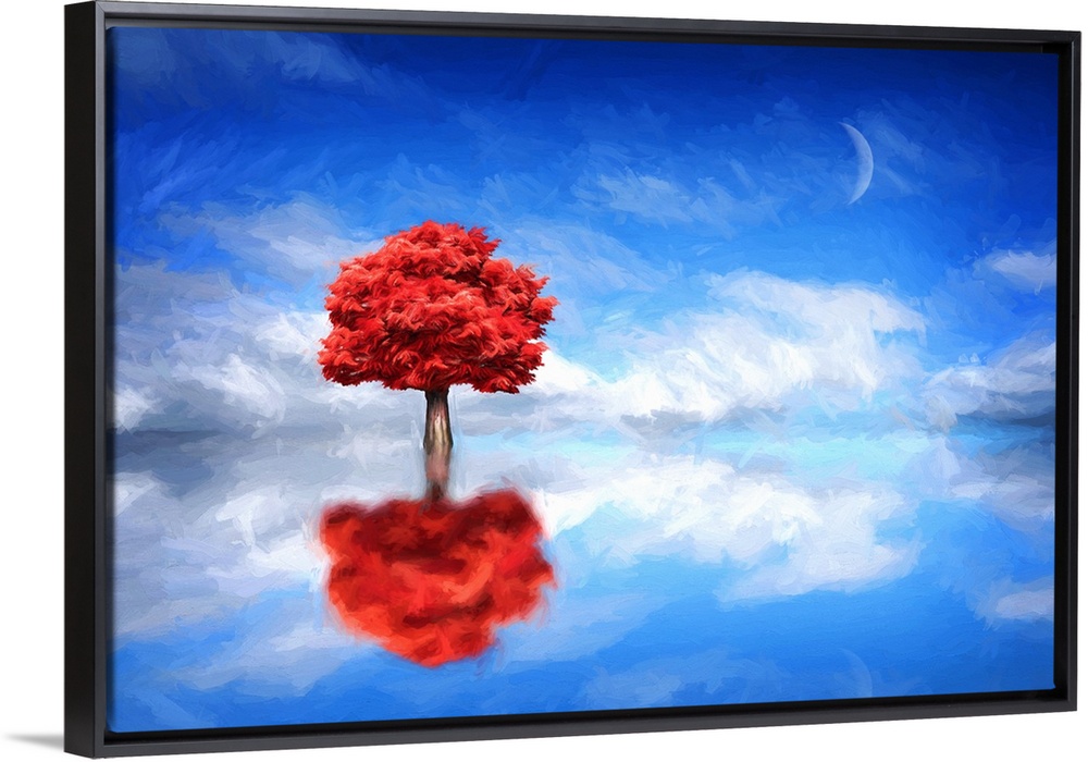 <p>A photograph of a tree with red foliage standing on a reflective watery landscape.</p>