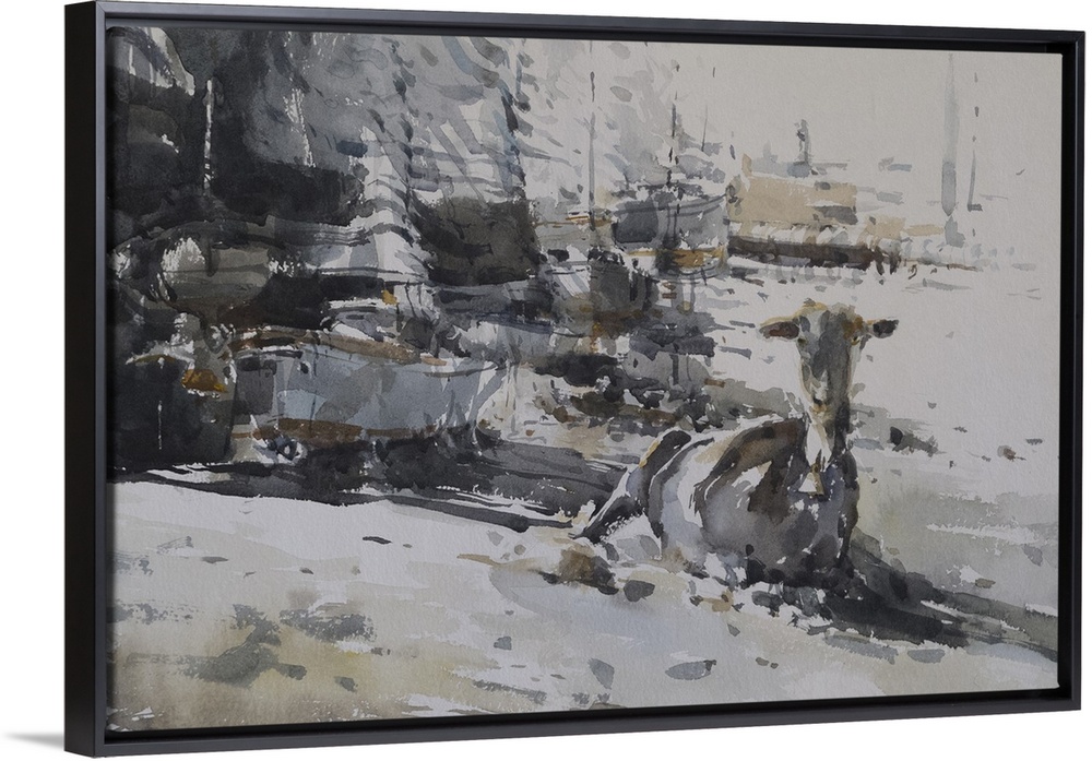 <p>Caught up in the middle of restless marina, a lone goat with sea legs lies in the sand in this contemporary artwork.</p>