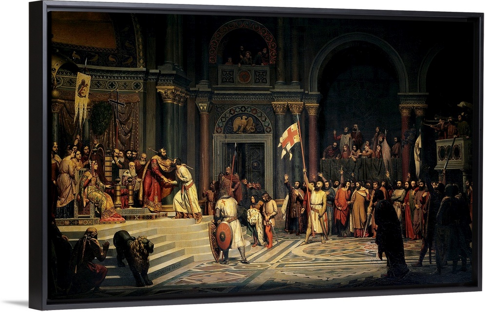<p>First Crusade : Godfroy of Bouillon (1061-1100), Duke of the Basse-Lorraine making a pact of allegiance to the Byzantine Emperor Alexius Comnenus in Constantinople,1097 Painting by Alexandre Hesse (1806-1879), 19th century. 1,96 x 3,10 m. Chateau de Versailles, France</p>