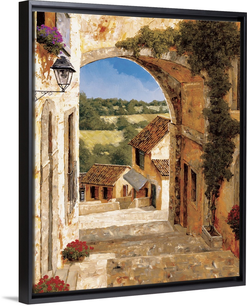 <p>Contemporary artwork of an alley in a rural European village.</p>