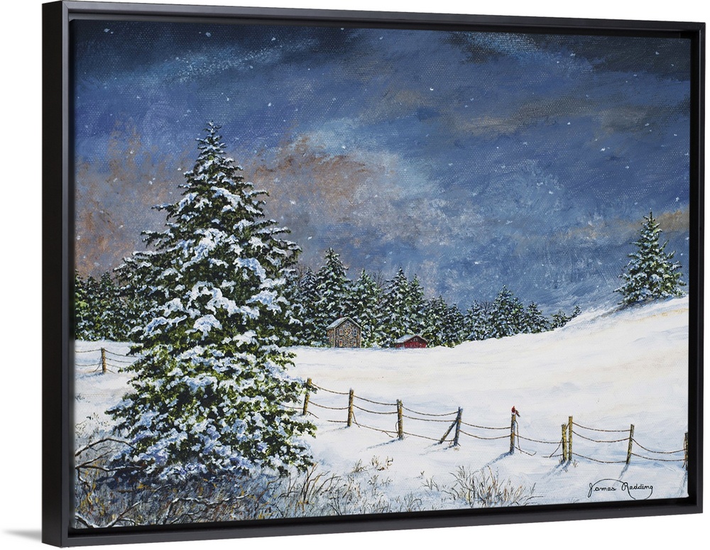 <p>A contemporary painting of a snowy landscape with a house and a red barn in the distance.</p>
