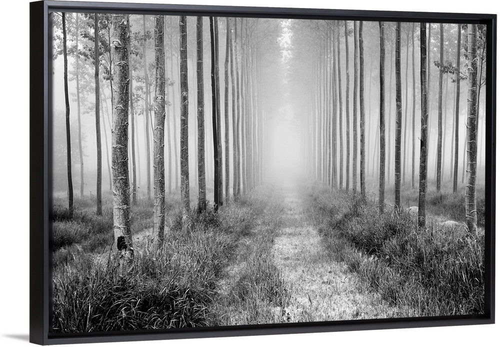 <p>A black and white monochrome symetrical avenue of fine trees balanced in zen harmony with mist.</p>