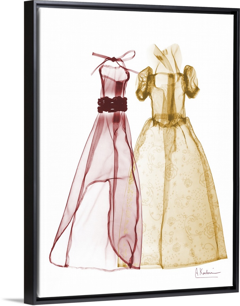 <p>Vertical x-ray photograph of two dresses, against a light background.</p>
