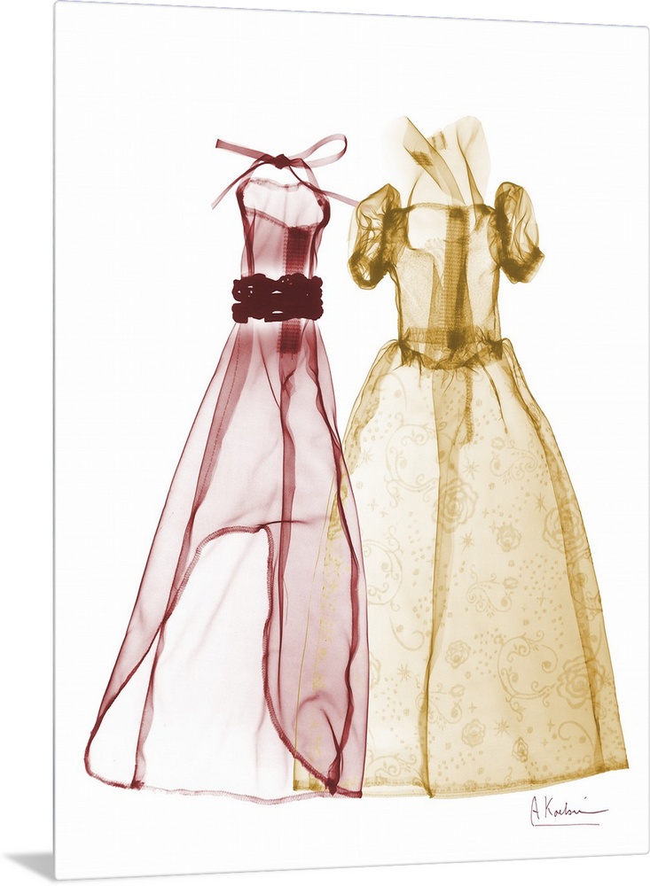 <p>Vertical x-ray photograph of two dresses, against a light background.</p>
