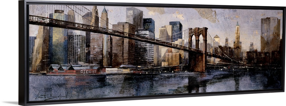 <p>A horizontal painting of Brooklyn Bridge with the New York cityscape behind.</p>