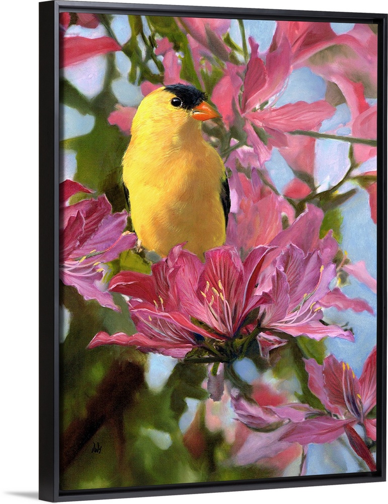 <p>Painting of a male goldfinch sitting on a pink flower.</p>