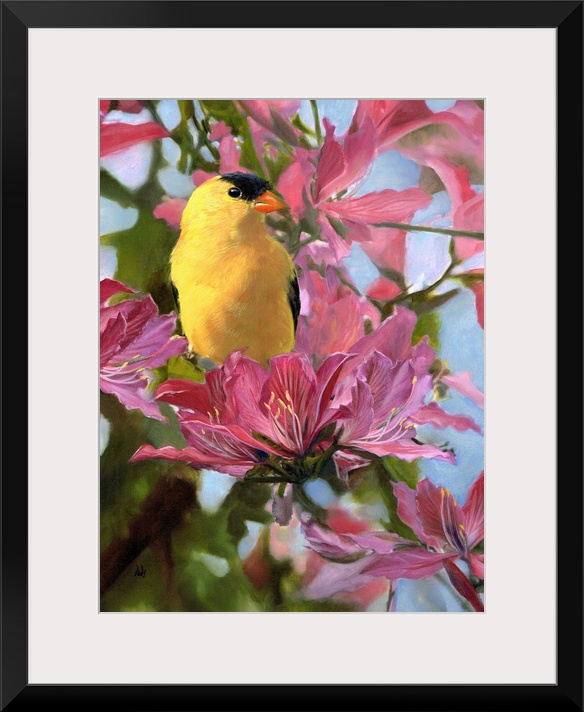 <p>Painting of a male goldfinch sitting on a pink flower.</p>