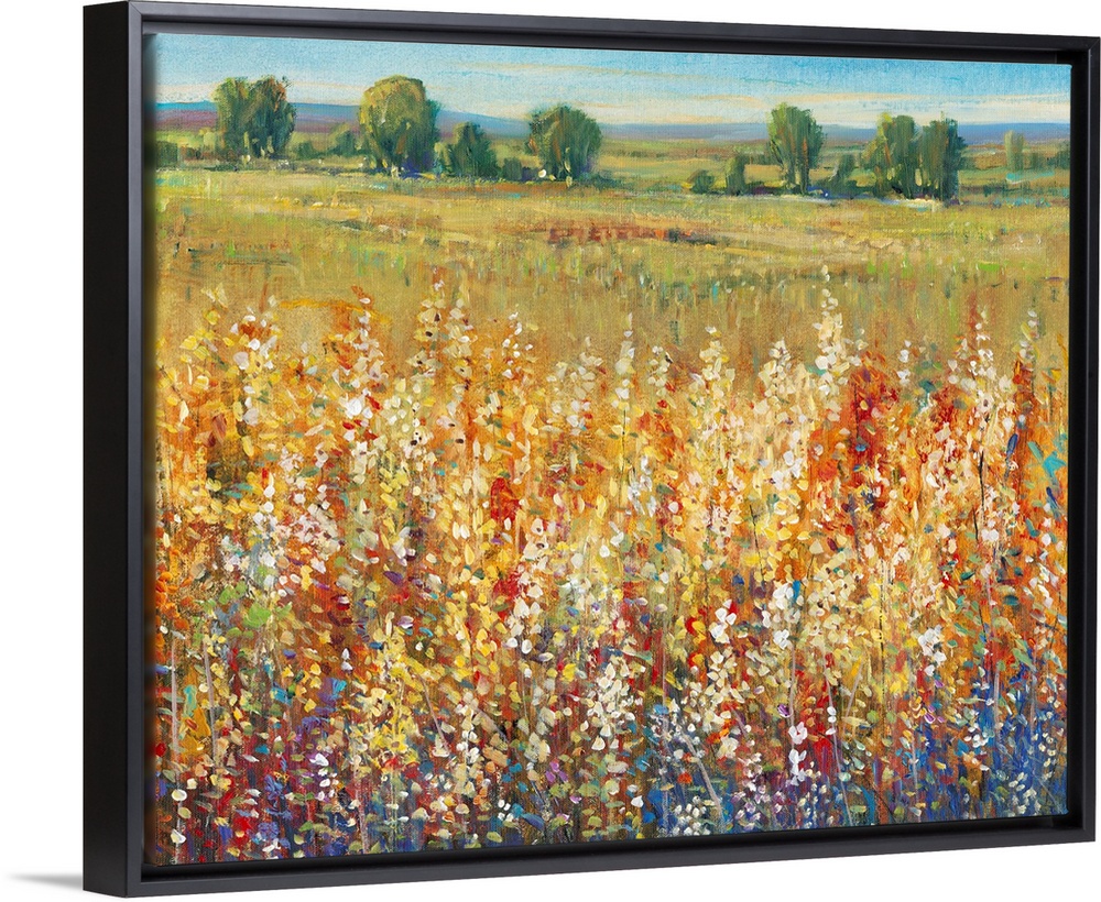 <p>Contemporary artwork of a field of yellow and red flowers with a green meadow in the distance.</p>