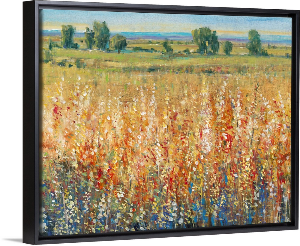 <p>Contemporary artwork of a field of yellow and red flowers with a green meadow in the distance.</p>